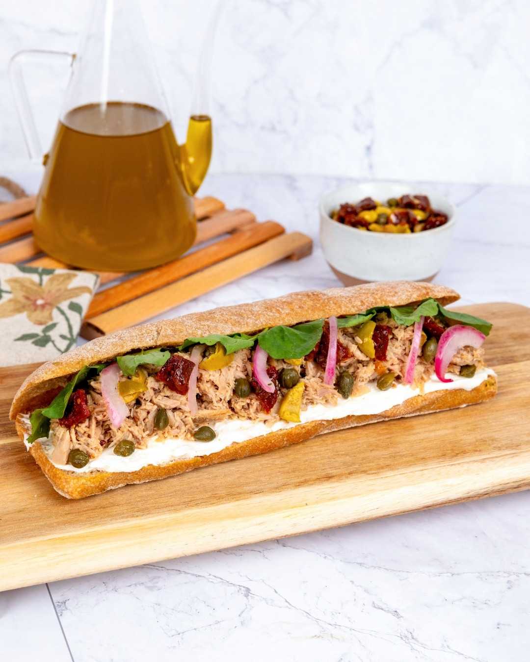 Tuna chunks with lemon vinaigrette, capers, sun-dried tomatoes, green olives, cream cheese, fresh arugulaĜ on handmade 100% sourdough bread.
