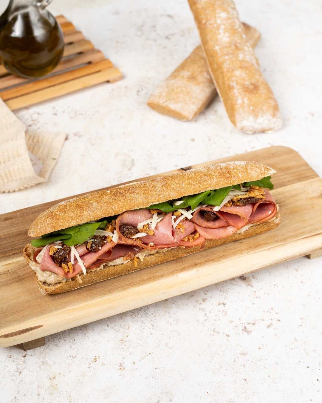 Premium roast beef slices, porcini mushroom sauce, caramelized onions, Parmigiano Reggiano shavings, fresh arugula, on handmade 100% sourdough bread.